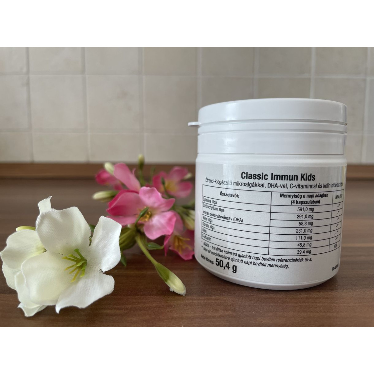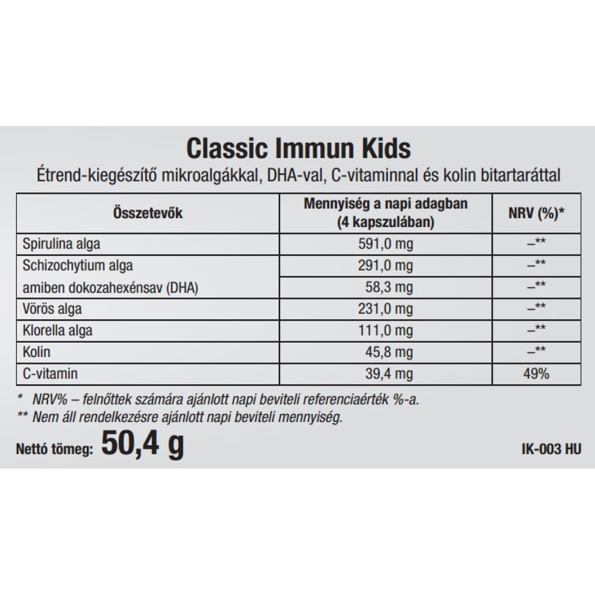 Összetevők: Spirulina Alga, Vörös Alga, Klorella Alga, Schizochytium Alga, Kolin, C-vitamin